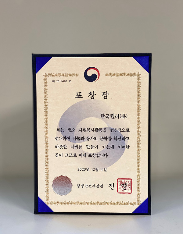 한국릴리는 지속적인 임직원 봉사활동을 통해 소외계층의 복지 증진에 기여한 공로를 인정받아 ‘2020년 대한민국 자원봉사대상’에서 행정안전부(행안부) 장관 표창을 받았다고 8일 밝혔다.
