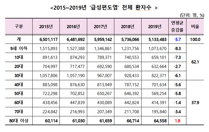 자료에 따르면 급성편도염 환자는 2015년 650만 명에서 2019년 513만 명으로 연평균 5.7% 감소했다. 다만 80대 이상 진료환자 수는 연평균 1.8% 증가한 것으로 나타났다.