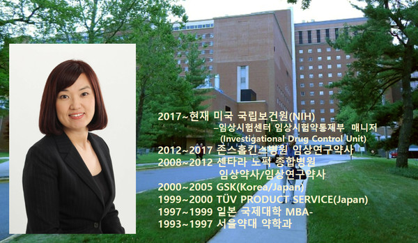 "처음 미국에 정착한 지역에는 제약회사가 없었어요. 자연스럽게 약사로서 전문성을 살리고 싶었는데, 당시는 임상약사 수요가 공급보다 많았던 시절이었습니다. 미국약사 자격증을 취득한 후에 임상약사로 커뮤니티 종합병원에서 근무했어요. 이후 한국, 일본에서의 제약 경험과 약사로서의 전문성을 살려 메릴랜드주 볼티모어에 있는 존스홉킨스병원에서 2012년부터 임상연구약사(clinical research pharmacist)가 됐어요. NIH에는 2017년에 왔고요."