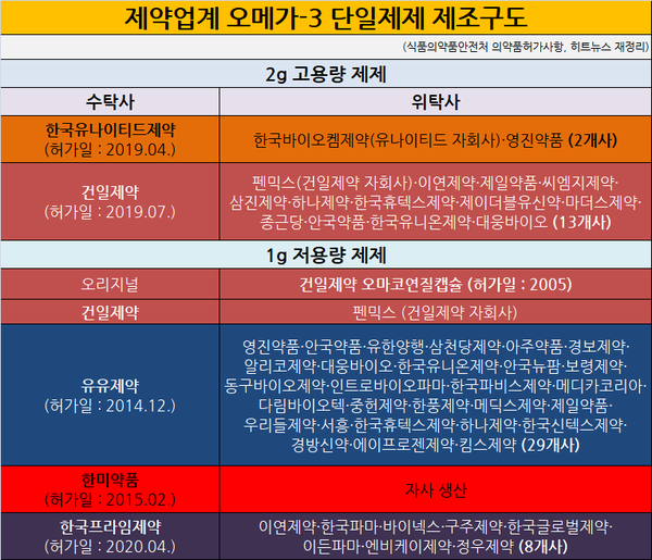 유유제약은 지난 2015년 오메가3 1g 제제 퍼스트제네릭 '뉴마코'를 허가받고 29개사의 제품을 생산해주고 있다. 위탁사 입장에서는 1g 제제는 합리적 가격으로 유유제약에 맡기더라도, 2g 제제는 기술력 갖춘 건일제약 또는 한국유나이티드제약에 맡길 수밖에 없다.