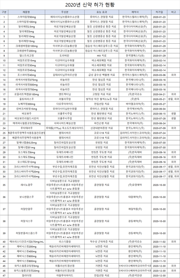 지난해 코로나19 치료제 '렘데시비르'를 비롯해 23성분 47품목이 신약으로 허가를 받았다. 국내 제약사가 개발한 신약은 유영제약의 골관절염 치료제 '레시노원주'로 파악됐다.