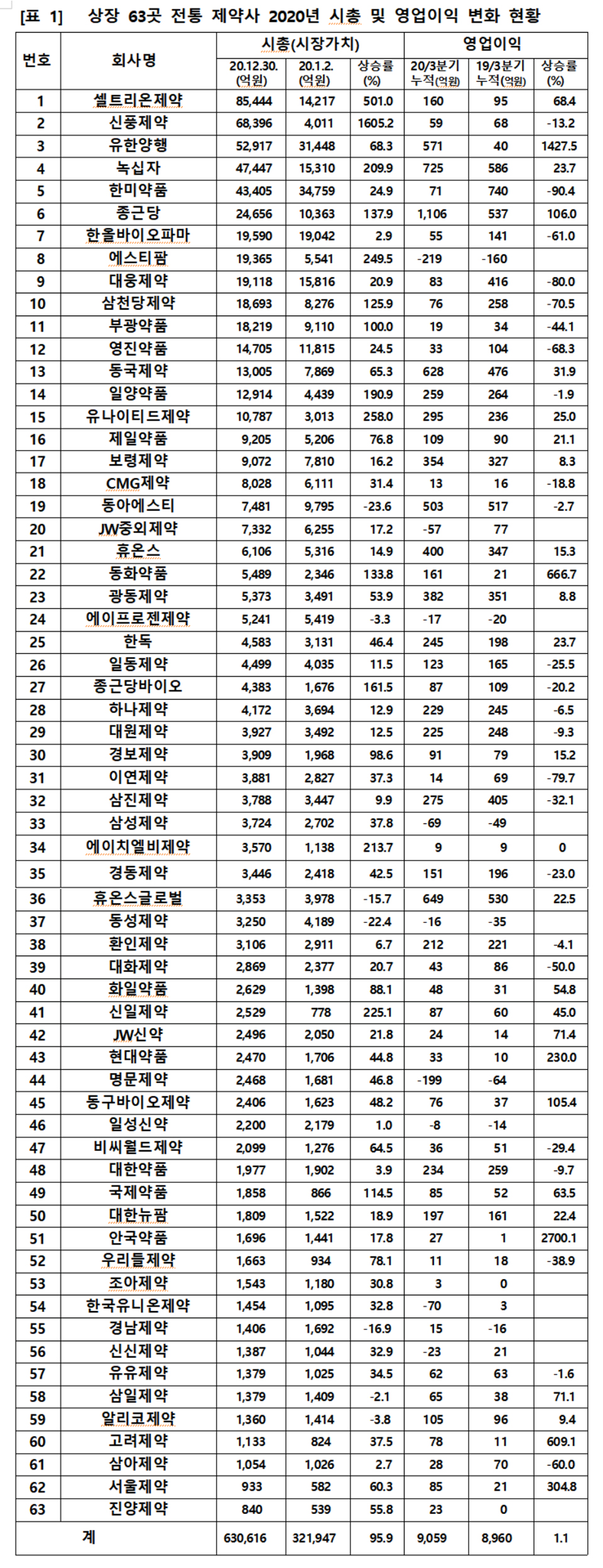상장 전통제약사 63곳의 전년 대비 3분기까지 누적 영업이익상승률은 고작 1.1%에 지나지 않았다(표1 참조).