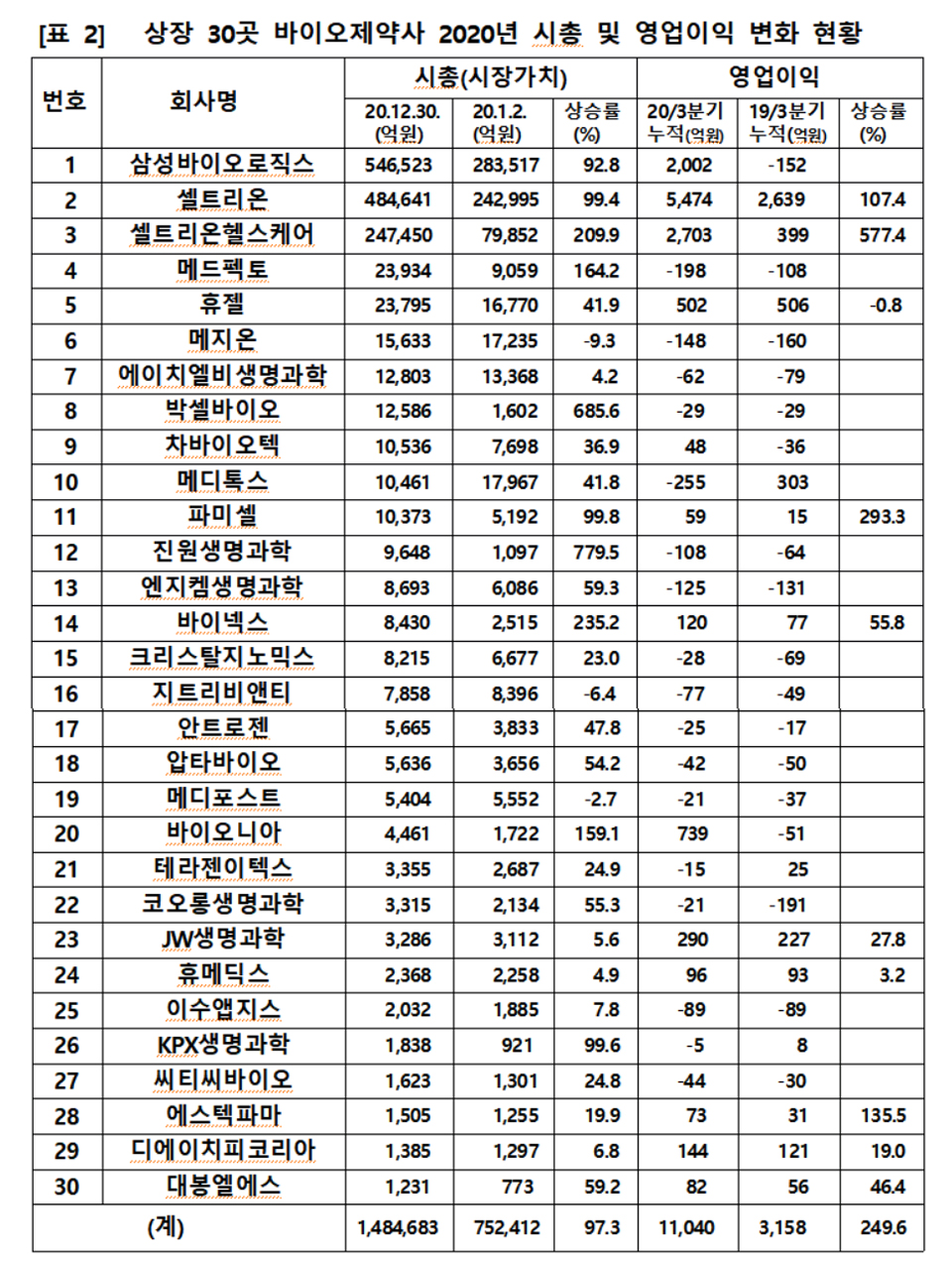 주요 30곳 바이오제약사들의 작년 3분기 누적 영업이익과 시총 현황을 보면(표2 참조), 전전년과 전년 동기 대비 누적 영업이익 상승률은 249.6%, 작년 연말의 연초 대비 시총은 97.3% 증가된 것으로 나타나고 있다.