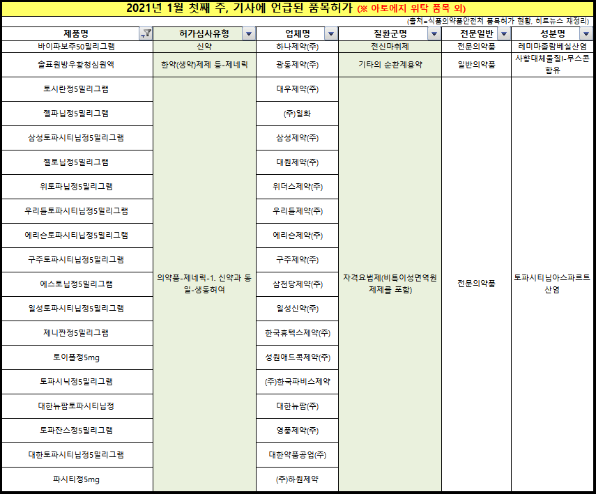 2021년 새해 첫 1월 1주(4~8일) 134품목이 신규 허가받았다. 이 중, 66품목이 종근당 이상지질혈증 복합제 '리피로우젯(구 아토에지, 아토르바스타틴·에제티미브)' 자료를 허여받은 후발 약이다. 이로써 종근당의 위탁사 명단도 허가와 함께 공개됐다.