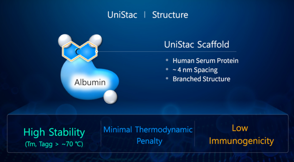 박=일반적으로 복잡한 구조를 가지게 되는 다중표적 치료제 개발플랫폼이 만족해야 할 가장 중요한 기준들입니다. 물질 개발에서 가장 중요한 것이 안정성(stability)과 면역원성입니다. 저희 UniStac 파이프라인들은 모두 70도 이상의 녹는점(Tm) 등을 가지고 있습니다.