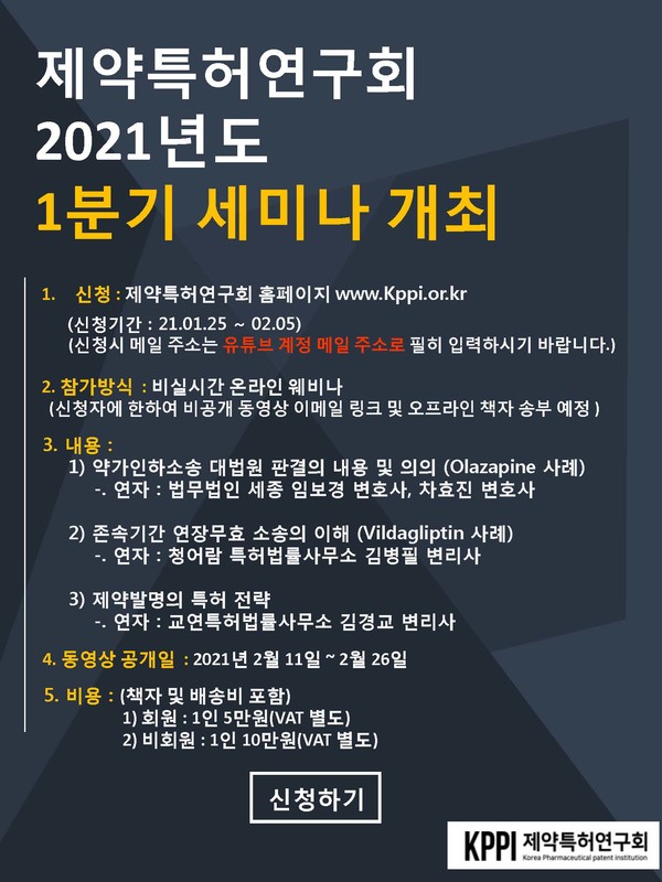 김윤호 제약특허연구회장은 "코로나19라는 특수 상황을 맞아 올해 첫 번째 세미나를 온라인으로 진행하게 됐다"며 "최근의 중요한 특허이슈들을 일목요연하게 정리하고 분석해 볼 수 있는 양질의 강의를 준비했다. 특허분야 제약인들에게 매우 유익한 강좌가 될 것으로 기대한다"고 했다.