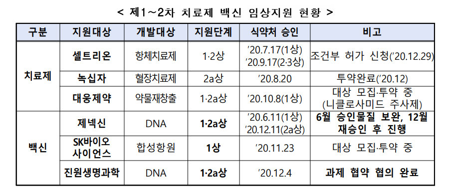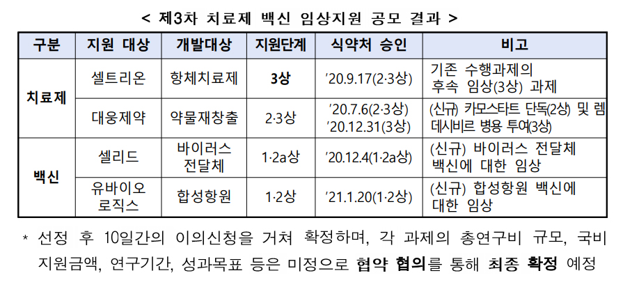 백신은 제넥신, SK바이오사이언스, 진원생명과학, 셀리드, 유바이오로직스 대상 치료제는 셀트리온(2과제), 녹십자, 대웅제약(2과제) 대상이다.