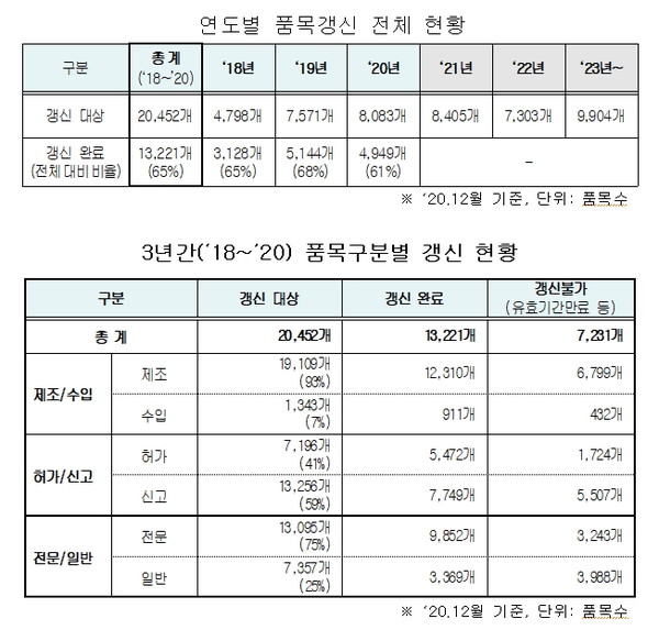 갱신 완료 현황을 보면 제조품목(93%, 1만 2310개)이 수입품목(7%, 1343개)보다 많이 갱신됐고, 의약품 종류로는 화학의약품(89%, 1만 1706개)이 대다수를 차지했다.