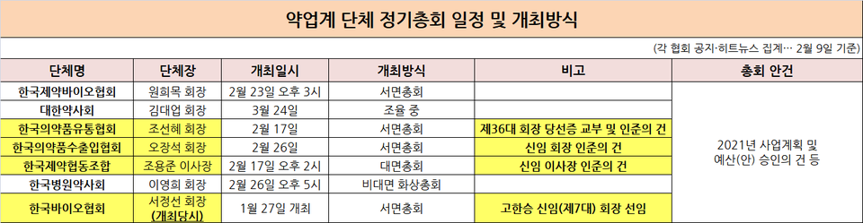 한국바이오협회는 지난달 27일 총회를 마쳤고 한국의약품유통협회와 한국의약품수출입협회는 서면으로 한국제약협동조합은 불가피하게 대면 총회를 열 예정이다.