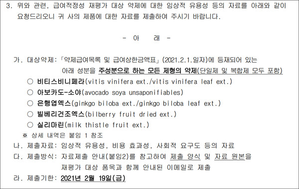 히트뉴스가 입수한 공문에 따르면 대상약제는 약제급여목록 및 급여상한금액표(2021년 2월 1일자)에 등재돼 있는 △비티스비니페라, △아보카도-소야 △은행엽엑스 △빌베리건조엑스 △실리마린 등 5개 성분을 주성분으로 하는 모든 제형의 약제(단일제, 복합제 모두 포함)다.