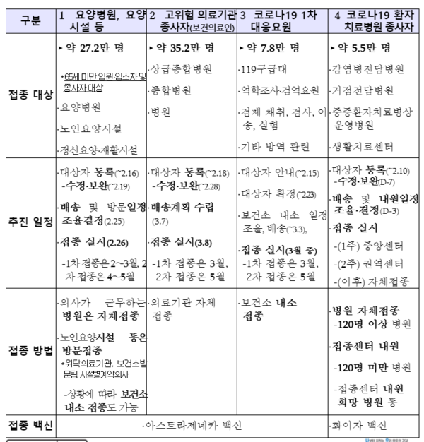 아울러 접종 순서에 따라 고위험 의료기관의 보건의료인 35만4000명에 대한 접종은 3월 8일, 방역·역학조사·검사, 검역요원 등 코로나19 1차 대응요원 7만8000명에 대한 접종은 3월 22일부터 시작한다.