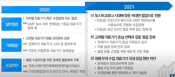 식약처가 18일 온라인 개최한 '의료기기 온라인 정책설명회'에 따르면 2021년도 의료기기 안전관리 방안으로 ▲추적관리대상 의료기기, ▲고위험군 의료기기 기획점검, ▲고위험군 의료기기 품목점검 등이 시행된다.