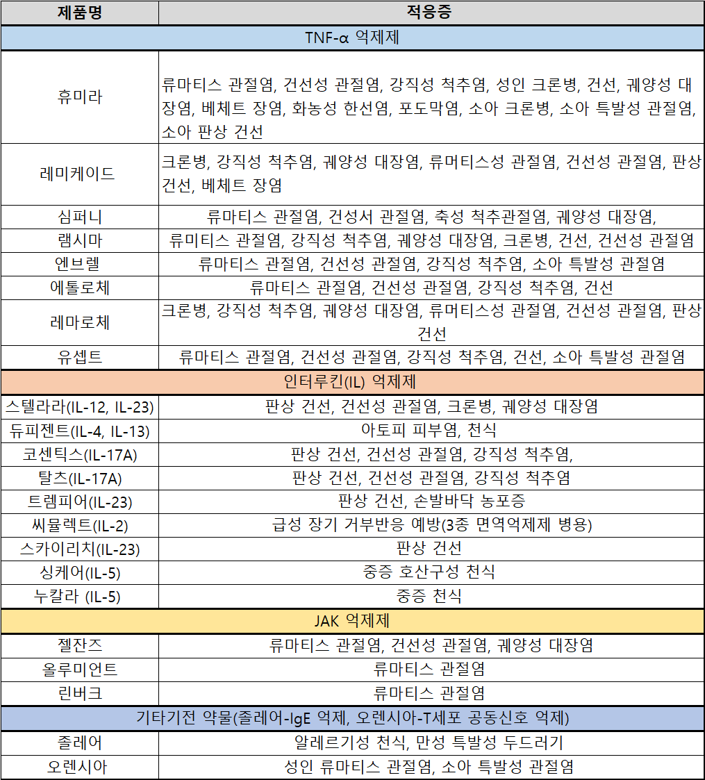 시장조사데이터 아이큐비아에 따르면, TNF-α 억제제 시장에서 애브비의 휴미라(아달리무맙) 2020년 매출은 1040억원으로, 2019년 매출대비 8% 증가했다. 가장 높은 성장세를 보인 것은 JAK 억제제인 릴리의 올루미언트(바라시티닙)로, 2020년 매출이 전년대비 309% 성장하며 90억원을 기록했다.