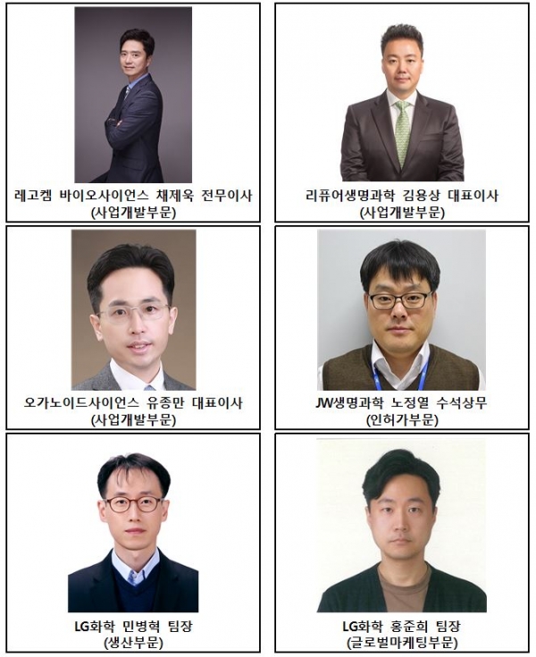 이와 함께 산업계 혁신성과를 창출, 실용화에 연계한 전문가로 ▲김용상 리퓨어생명과학 대표이사 ▲노정열 JW생명과학 수석상무 ▲민병혁 LG화학 팀장 ▲유종만 오가노이드사이언스 대표이사 ▲채제욱 레고켐바이오사이언스 전무이사 ▲홍준희 LG화학 팀장 등 6인(성명 가나다순)이 인정받아 제7회 제약산업 혁신성과 실용화 연계 우수전문가 표창을 받는다.