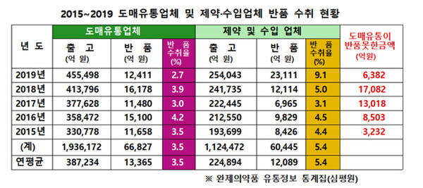 최근 5년(2015년~2019년) 간 도매유통업체들이 출고한 의약품 중 반품된 금액은 총 6조6827억 원이나 됐으며, 제약업체(수입포함)의 반품도 6조445억 원이 넘었다.