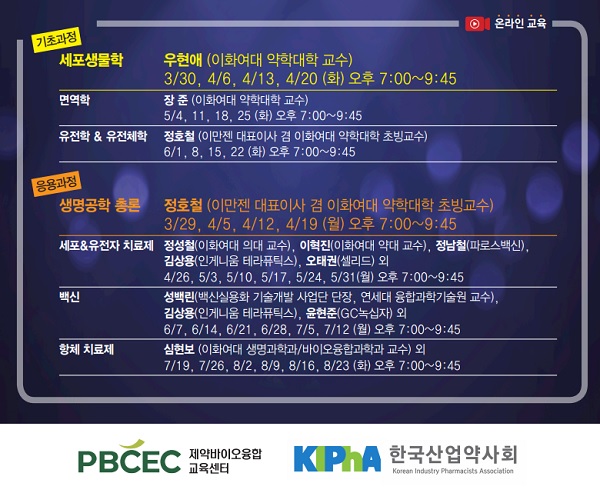 강좌는 '기초과정'과 '응용과정'으로 나눠 진행된다. '기초과정'은 바이오 의약품의 필수 기초과학의 핵심요약으로 ▲세포생물학 ▲면역학 ▲유전학&유전체학 강좌로 구성됐고 '응용과정'은 ▲생명공학총론 ▲세포&유전자치료제 ▲백신 ▲항체치료제 강좌로 구성돼 제약산업에서의 개발, 생산 관련 산업현장 전문가의 사례연구가 포함된다.