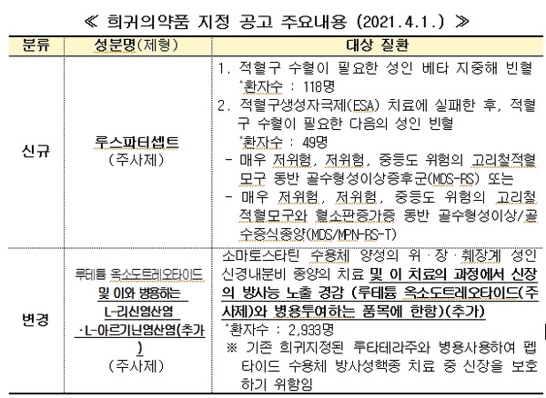 식품의약품안전처는 베타 지중해 빈혈 등 희귀성 빈혈 치료에 사용되는 '루스파터셉트'를 희귀의약품으로 신규 지정하고, 희귀성 종양 치료에 사용되는 기존의 희귀의약품 '루테튬 옥소도트레오타이드'는 성분명과 대상질환을 추가해 1일 공고했다.