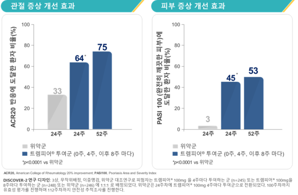 특히, 생물학적제제 치료 경험이 없는 환자를 대상으로 진행한 DISCOVER-2 연구에서 8주 마다 트렘피어 투여한 군의 64%가 24주 차에 ACR20 반응에 도달했으며, PASI 90 및 PASI 100에 도달한 환자는 각각 69% 및 45%로, 위약군 대비 모두 유의한 증상 개선 효과를 보였다.