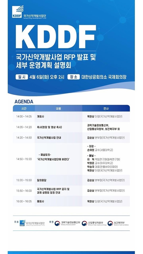 이번 설명회는 △국가신약개발사업 안내, △패널토의 ’국가신약개발사업단에 바란다‘, △질의응답, △국가신약개발사업 RFP 공지 및 과제 설명회 일정 안내 등 총 4개 세션으로 구성된다.