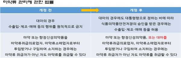 아울러, 2019년 3월 12일 '마약류 관리에 관한 법률 시행령'을 개정해 자가치료용 '의약품으로서 대마'에 한해 의료용으로 허용하는 법령개정이 마무리됐다.