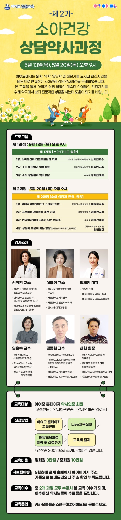 어린이 여성건강을 위한 약사모임(대표약사 정혜진, 이하 어여모)이 소아건강을 주제로 약사 대상 교육에 나선다. 어여모는 다음달 13일과 20일 오후 9시 '제2기 소아건강 상담약사과정' 전문교육을 개최한다고 19일 밝혔다.
