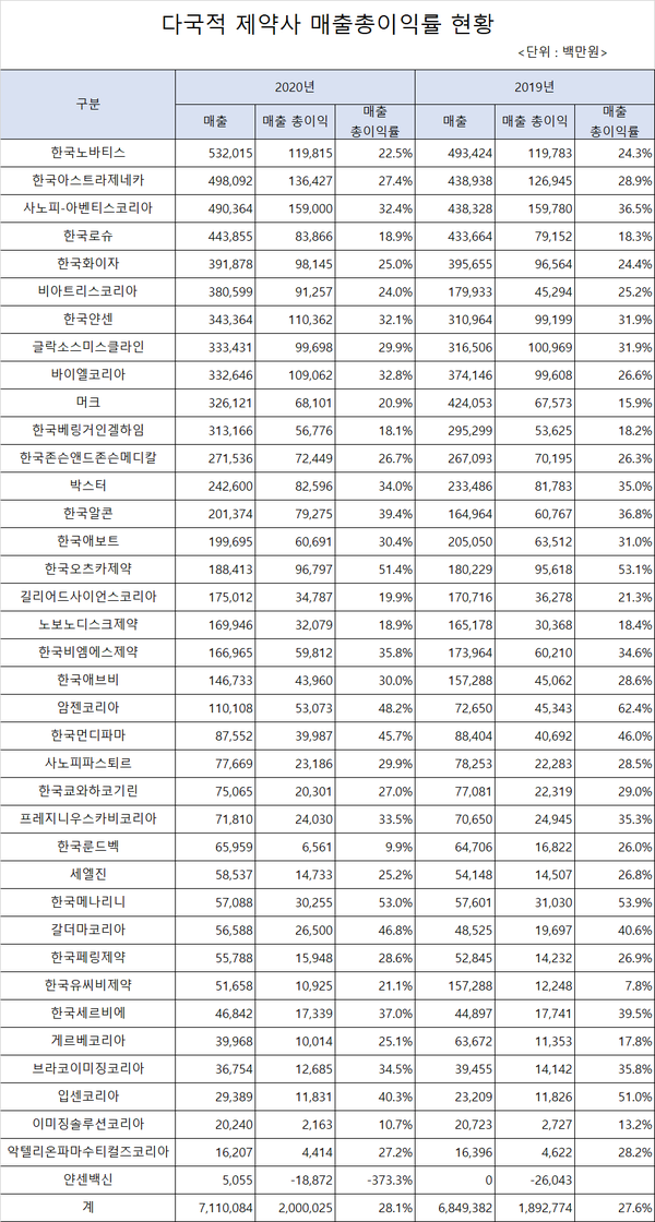 다국적 제약사의 매출총이익률 28.1%는 국내 상장제약사의 39.6%보다 낮고, 의약품유통업체의 6.9%보다 높은 것이다.