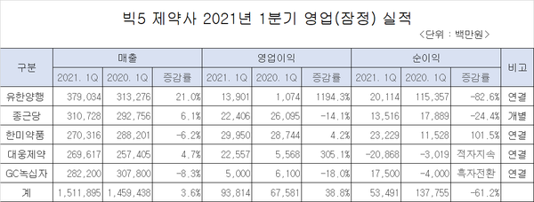 빅5 제약사 1분기 매출 평균 3.6% 증가… 영업이익 39%늘고 순이익 61% 줄어
