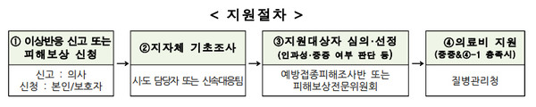 지원절차는 코로나19 예방접종 후 ①이상반응 신고 또는 피해보상 신청 사례에 대해 ②지자체 기초조사 및 ③피해조사반 또는 피해보상 전문위원회 검토결과 중증이면서 인과성 근거자료 불충분으로 판정(④-1) 받은 경우, 코로나19 예방접종을 받은 사람 또는 보호자는 지원신청 구비서류를 갖춰 주소지 관할 보건소에 의료비 지원을 신청하면 된다.