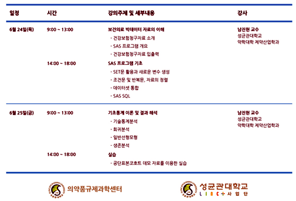 의약품규제과학센터는 6월 24일과 25일 이틀간 제약바이오산업계의 역량강화를 위한 교육프로그램으로 '보건의료 빅데이터 자료분석, 기초 이론 및 실습과정'을 진행한다.