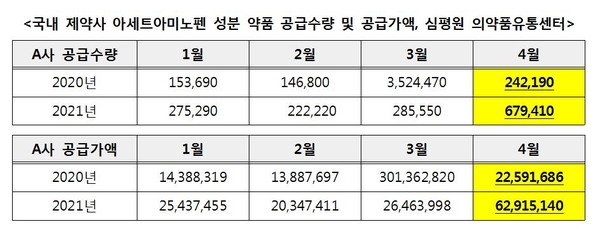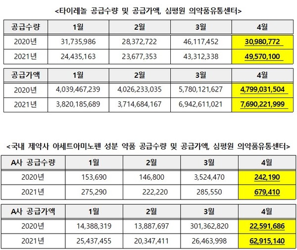 이 기간 공급가액도 약 47억9000만원 수준에서 76억9000만원으로, 약 30억원 가까이 증가했다. 반면, 서 의원에 따르면 국내 제약사의 아세트아미노펜 성분 동일제제 유통량은 타이레놀에 비해 변화량이 미미했다.