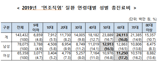 2019년 기준 연조직염 질환 건강보험 구성비를 연령대별로 살펴보면, 60대가 16.8%(241억원)으로 가장 많았고, 50대 16.7%(239억원), 70대 14.9%(214억 원)의 순이었으며 특히, 남성이 70대까지 전 연령층에서 여성보다 진료비가 많았다.