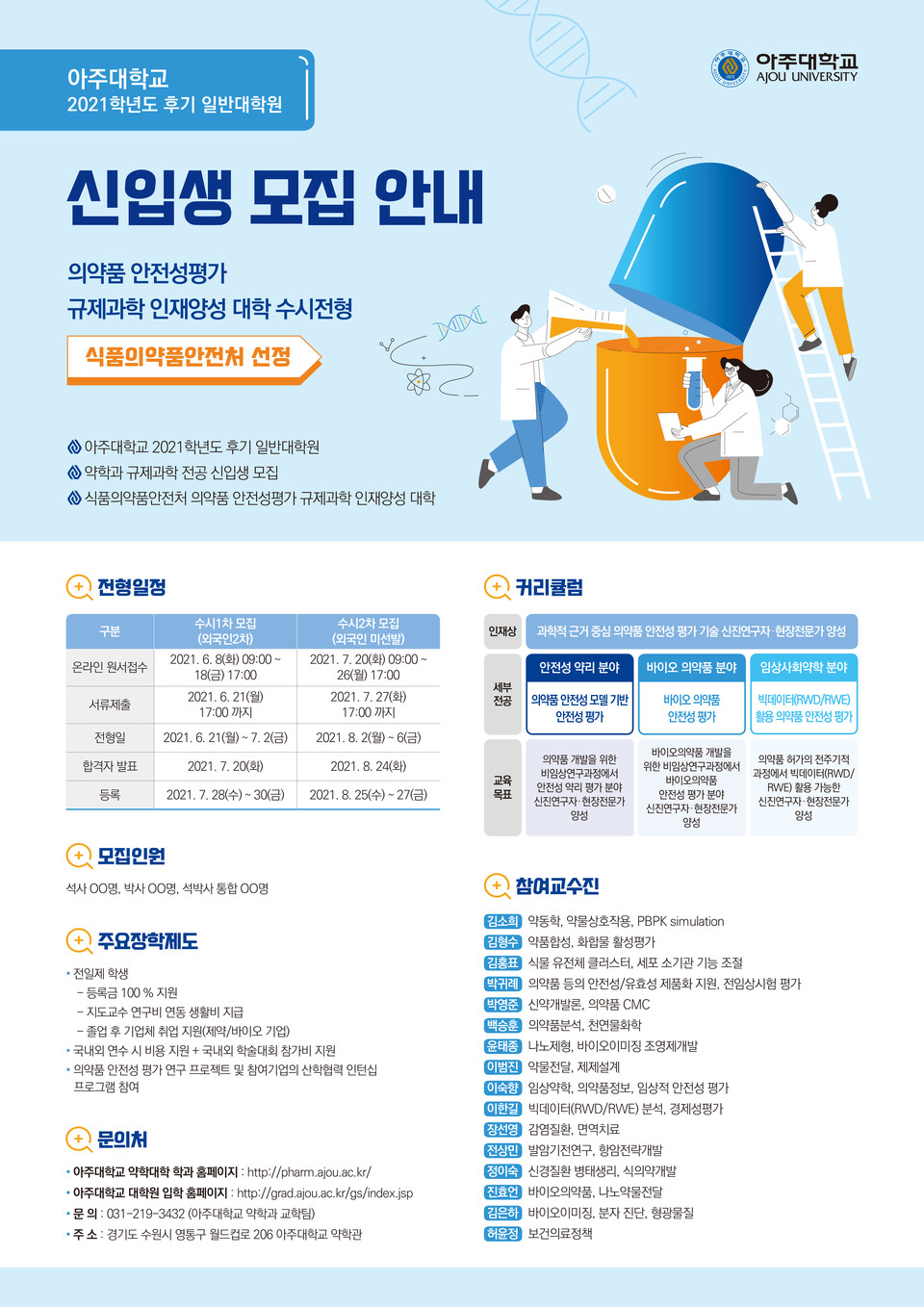 아주대학교 약학대학이 규제과학 전공 신입생을 모집한다.