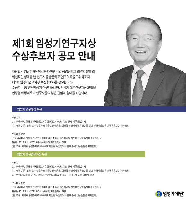 총 상금 3억원이 수여되는 '제1회 임성기 연구대상' 수상 후보자 공모가 내달 31일까지 진행된다. 만 45세 미만 젊은 연구자를 대상으로 하는 '제1회 임성기 젊은연구자상' 수상 후보자 공모도 동시 진행된다.