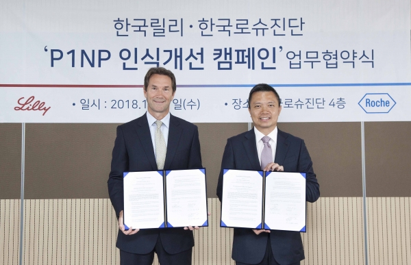 한국릴리(사장: 폴 헨리 휴버스, 이하 릴리)와 한국로슈진단㈜(대표이사: 리처드 유, 이하 로슈진단)은 10월 20일 ‘세계 골다공증의 날’을 맞아 올바른 골다공증 치료 및 관리를 위한 골형성표지자검사 ‘P1NP 테스트’ 인식 개선 상호업무협약(이하 MOU)을 17일 한국로슈진단에서 체결했다.