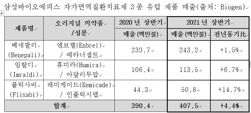 삼성바이오에피스 자가면역질환 치료제 3종(베네팔리,임랄디,플릭사비) 상반기 유럽 제품매출 4억 750만불로 전년 동기대비 4.4% 상승했다.