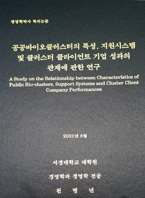 그는 최근 서경대학교 대학원에 제출한 '공공바이오클러스터의 특성, 지원시스템 및 클러스터 클라이언트 기업 성과의 관계에 관한 박사 학위 연구'가 논문 심사위원회를 통과했다고 말했다. 스스로 제시한 가설을 입증하는데 꼬박 5년 반 걸렸다.