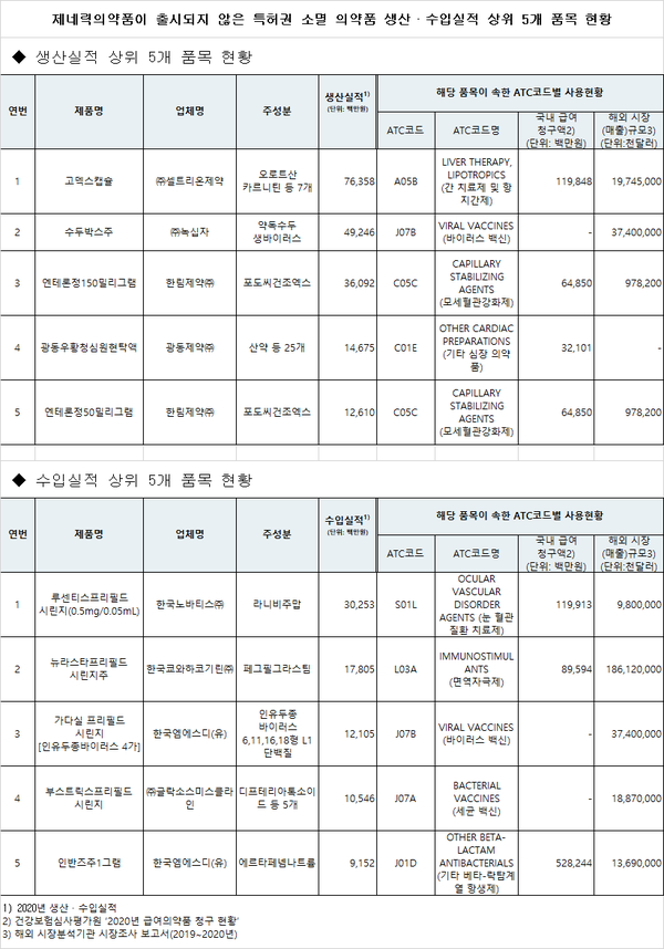 특허권이 소멸됐음에도 제네릭이 미출시된 의약품중 생산실적 1위 품목은 셀트리온제약의 '고덱스캡슐'이며, 수입실적 1위 품목은 한국노바티스㈜의 눈 혈관질환 치료제 '루센티스프리필드시린지(0.5mg/0.05mL)'이다.