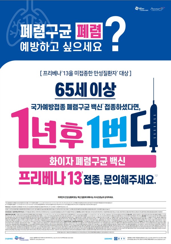 한국화이자제약(대표이사 사장 오동욱)은 이번달부터 국가예방접종으로 23가 폐렴구균 백신을 접종 받은 만 65세 이상 만성질환자를 대상으로 13가 폐렴구균 백신인 프리베나®13의 접종 중요성을 알리는 '1년 후 1번 더' 캠페인을 진행한다.
