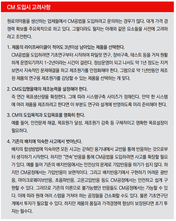 CM도입은 단순히 한 제품의 가격경쟁력을 향상하려고 단기간 투자하여 효과를 볼 수 있는 과제가 아니다. 기존의 배치공법이 원료의약품 산업에 기여한 것만큼 그 기초와 배경을 뿌리채로 흔들어 놓을 수 있는 경험축적이 필요하다. 필자는 국내의 정밀화 학, 화학공학, 석유화학, 의약품산업 등에서 많은 경험과 선진기술을 융합적으로 이용하게 되면 충분히 미국, 유럽, 일본 등 글로 벌제약회사들에서 CM공법을 이용하여 원료의약품을 제조해 온 그 차이를 따라잡을 수 있다고 본다.