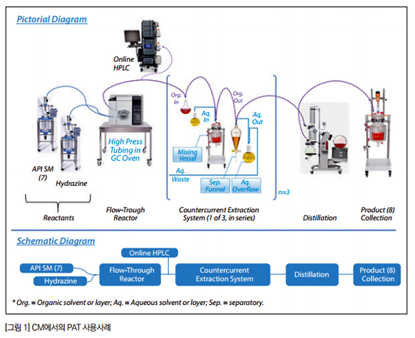 API 제조공정에 CM을 도입하는 것은 제약산업에서 플랜트 최소화 및 친환경공정 도입, 비용 절감, 보다 일관되고 안정된 품질로 제품을 제조하도록 공정을 개선하는 데 엄청난 도움을 주고 있다. CM을 도입하는 데는, 융합적인 공정기술과 제품 지식 그리고 실시간으로 공정조건을 제어할 수 있는 기술이 필요하다. 따라서 연구, 개발, 제조 전반과정에 온라인으로 모니터링하기 위한 효과적인 PAT 기술도입은 필수이다.