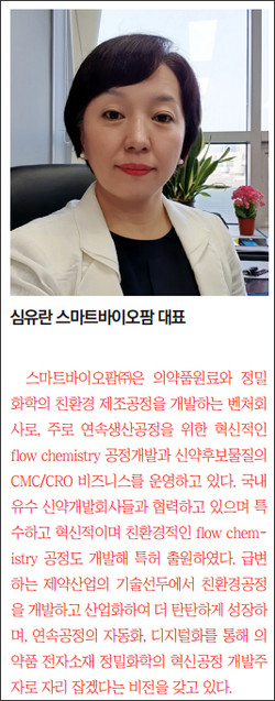 CM은 제조공법으로 기존의 배치타입과 비교해 수율 향상, 원자재 투여량 감축, 용매 절감, 반응시간 단축, 인력 감소, 후처리 절차 생략 등 우수한 장점을 가지고 있다. 물론 CM공법을 제조현장에 도입하려면 기초연구부터 공정확립, 장비구축 등 시간, 인력, 자금 투자가 필요하다. 아마 이 부분이 기존의 원료의약품 업체들이 섣불리 CM공법을 도입하지 못하는 주요원인일 수 있다.