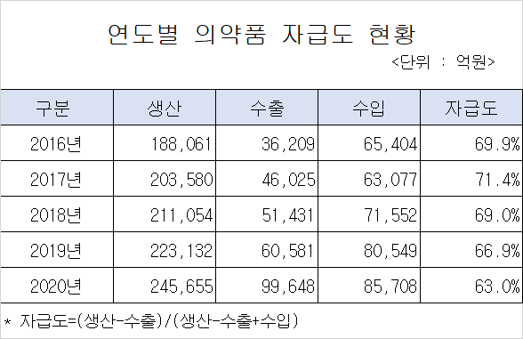 의약품 수출은 9조9648억으로 2019년 대비 62.5% 성장하고, 의약품 수입은 8조5708억으로 전년 대비 5.2% 늘어났다. 의약품 자급도는 63%로 역대 최저 수준을 경신한 것이다.