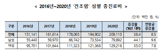 성별로 구분해보면, 남성은 9만5000원에서 2020년 12만3000원으로 29.8% 늘었고, 여성은 2016년 10만3000원에서 2020년 13만6000원으로 31.8% 증가했다.