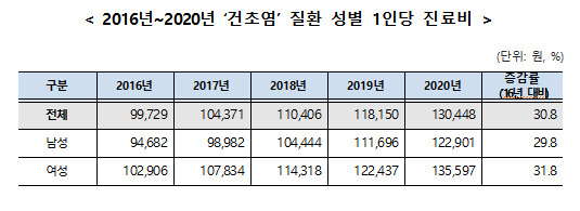진료인원은 2016년 151만6000명에서 2020년 160만 3000명으로 8만7000명이 증가했고, 연평균 증가율은 1.4%로 나타났다.