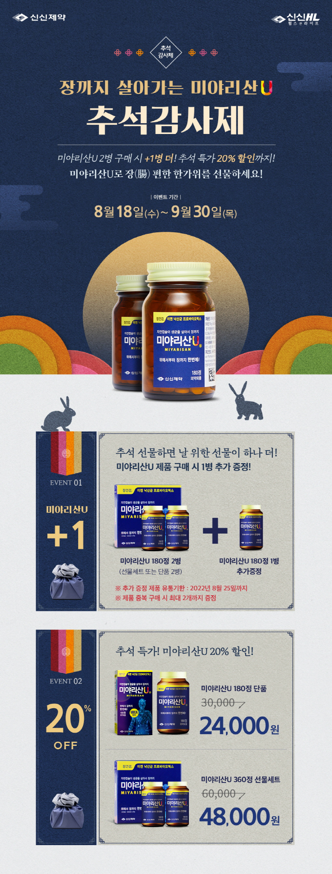 미야리산U 추석감사제는 오는 9월 30일까지 신신HL 브랜드 공식몰인 네이버 스마트스토어와 함께 신신HL 공식 인증마크가 있는 신세계몰, GS SHOP, CJ몰 등의 종합몰 및 G마켓, 옥션, 쿠팡, 11번가 등의 오픈마켓에서 진행된다.