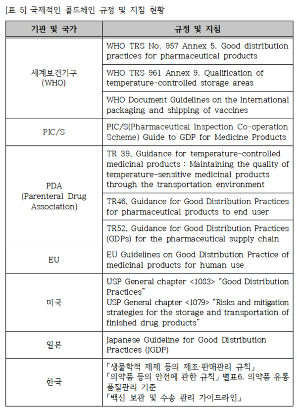 WHO는 ‘Good Distribution Practices for Pharmaceutical Products’(WHO Technical Report Series, No. 957, 2010)에서 콜드체인 보관 및 유통에 대한 기준을 제시하고 있다. 첫째, 사용하는 차량을 포함해 운송방법은 기후, 계절적 변화, 지역적 조건을 고려한다. 둘째, 온도 제어가 필요한 제품의 공급은 적절한 보관 및 운송 조건을 준수한다. 셋째, 운송 중에 주어지는 환경 조건(예: 온도 및 습도)과 다르거나 이를 제한하는 특수 조건이 필요한 경우에는 온도 모니터링 및 기록이 필요하다. 넷째, 온도 모니터링 조건에 사용되는 장비, 차량 및 용기는 정기적으로 검정 및 교정한다.