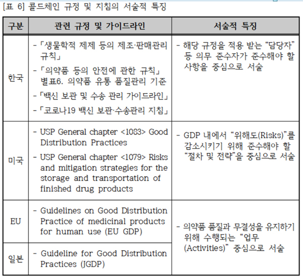 우리나라와 제약선진국인 미국·유럽(EU)·일본의 콜드체인 규정 및 지침을 비교해 보면 각기 다른 서술적 특징을 가지고 있다. 우리나라는 해당 규정을 적용받는 의약품 제조업자·수입자 및 도매상 등이 준수해야 할 사항들을 중심으로 서술하고 있는 반면, 미국은 “위해도(Risk)”를 감소시키기 위해 준수해야 할 “절차 및 전략”을 중심으로 서술하고 있으며, EU와 일본은 의약품의 품질과 무결성을 유지하기 위해 수행되는 “업무(Activities)”를 중심으로 서술하고 있는 것으로 분석된다.