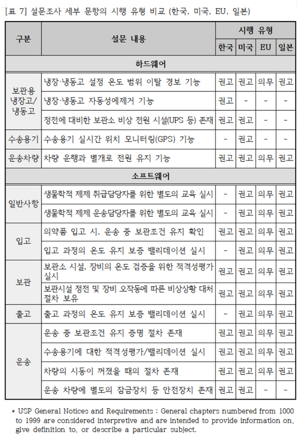 조사 대상 세부 문항은 우리나라에서는 권고사항이거나 규정되어 있지 않지만 미국, EU, 일본 중 최소 한 곳에는 규정되어 있는 사항들로서, 동 항목의 실시 여부를 토대로 제약선진국과의 콜드체인 운영 현황을 비교해 볼 수 있다.