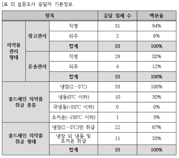 설문조사에 응답한 33개 도매상 중 직영으로 창고를 관리하는 업체는 94%, 직영으로 운송을 관리하는 업체는 88%로 조사됐다. 이들 업체 중 냉장 조건(2∼8℃)의 콜드체인 의약품만을 취급하는 업체는 67%, 냉장 조건 외에 냉동 또는 초저온 콜드체인 의약품도 취급하는 업체는 33%로 조사됐다.
