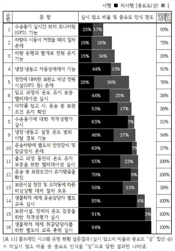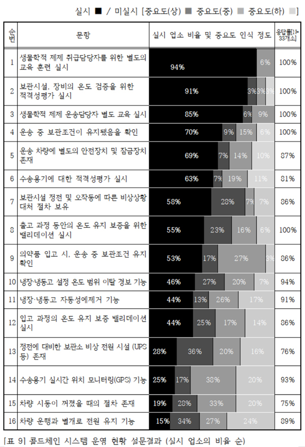 한편, 도매상들이 상대적으로 시행하고 있지 않으면서 중요도를 비교적 낮게 인식하고 있는 항목도 있었다. 특히 수송용기의 실시간 위치 모니터링 기능에 대해서는 실시 비율이 낮고 그 중요성에 대한 공감대도 부족한 것으로 이해된다. 따라서 이런 항목들은 그 필요성에 대한 재검토가 필요할 것으로 사료된다. (괄호는 실시 비율/중요도 ‘상’으로 인식 비율)